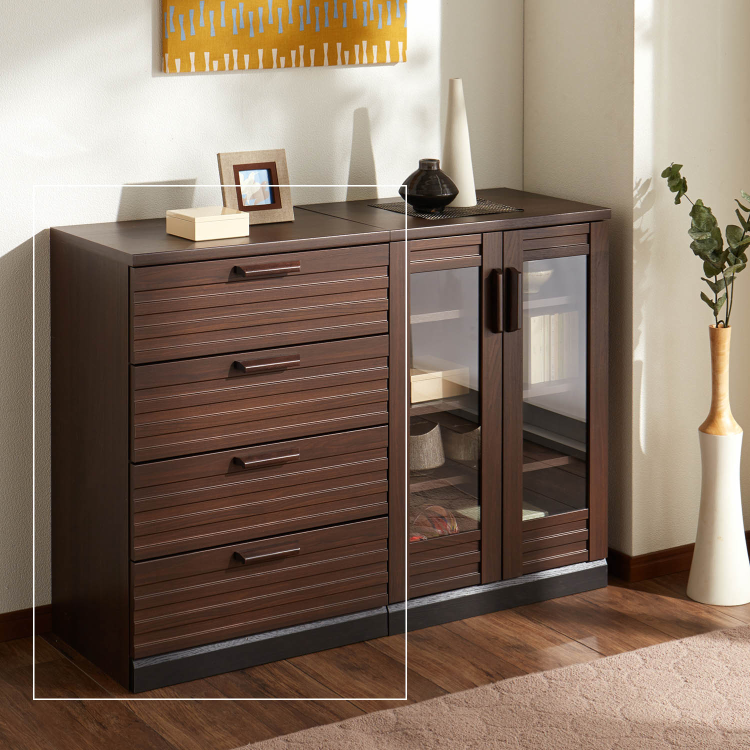 ●光沢感のある前板と、中身をほんのり隠すミスト調ガラスを組み合わせた、モダンで上品なガラス戸キャビネット