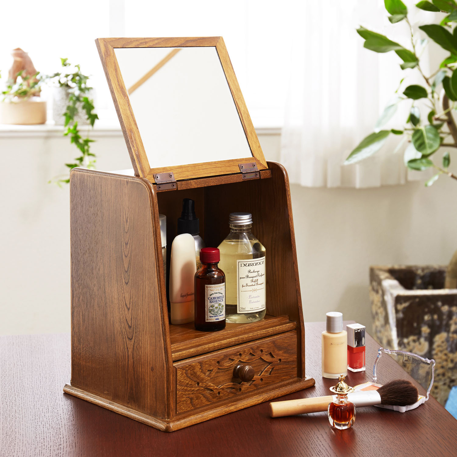 フタの裏が鏡になっているので、立ててメイクミラーにすれば、小さなドレッサーのように。