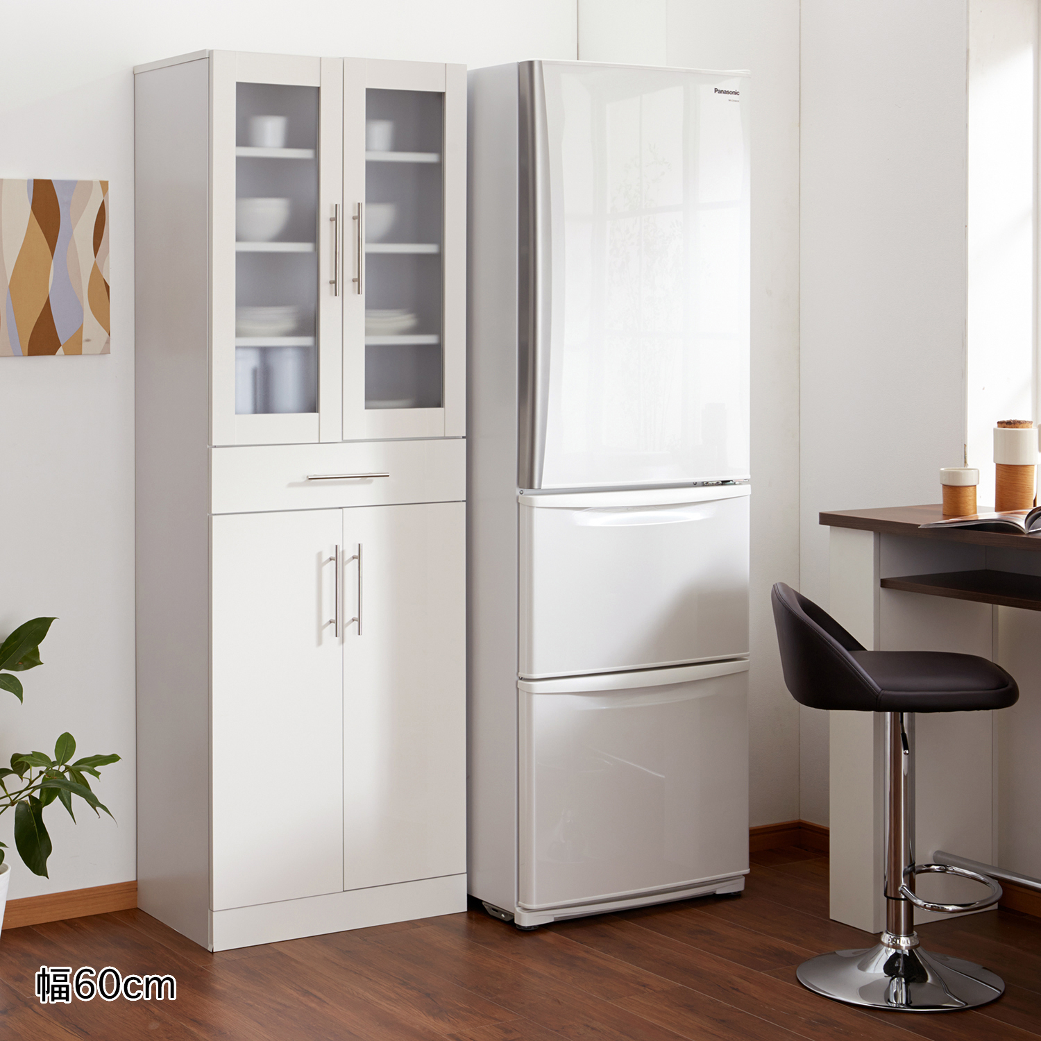 光沢感のある前板でモダンに仕上げたカップボード前板は汚れてもサッと拭き取れるので、お手入れもラクラクです食器収納部は、中身をほんのり隠すミスト調ガラスを採用カトラリーなどを収納できる引出しや、中に可動棚を備えた扉収納で、たっぷり & スッキリ収納することができますお好みに合わせて2サイズから
