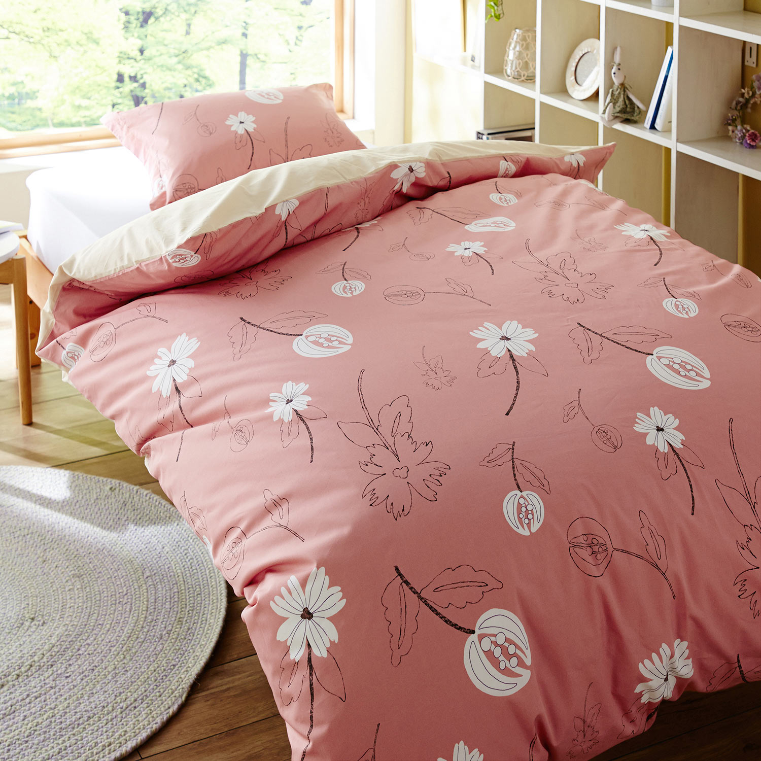 ●掛け布団の裏面とシーツはピンク色の無地。 |