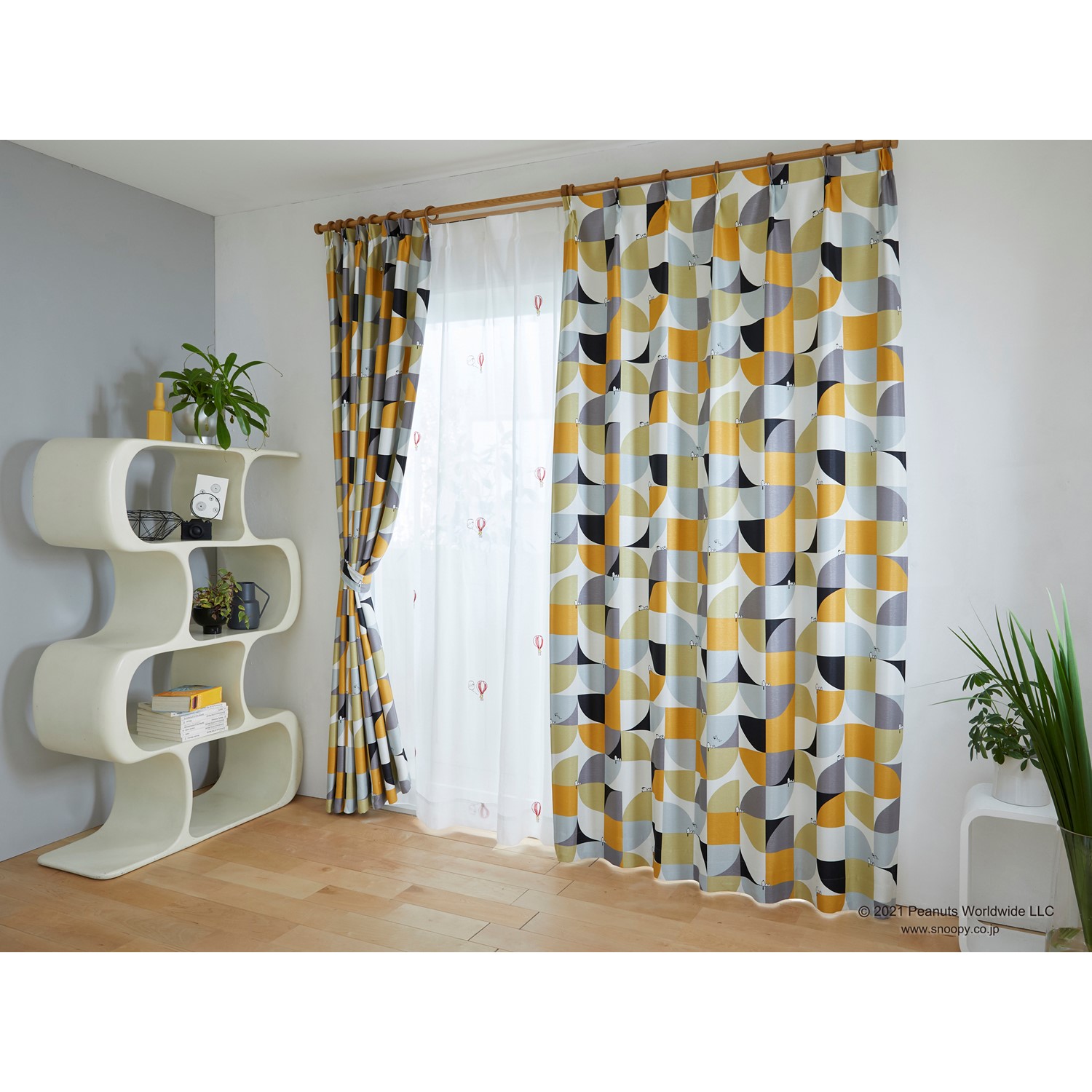 【ピーナッツ/PEANUTS】【58サイズ】プリント遮光カーテン・スリーピースヌーピー「スヌーピー」 柄の中で寝たりくつろいだりするスヌーピーの姿にキュン