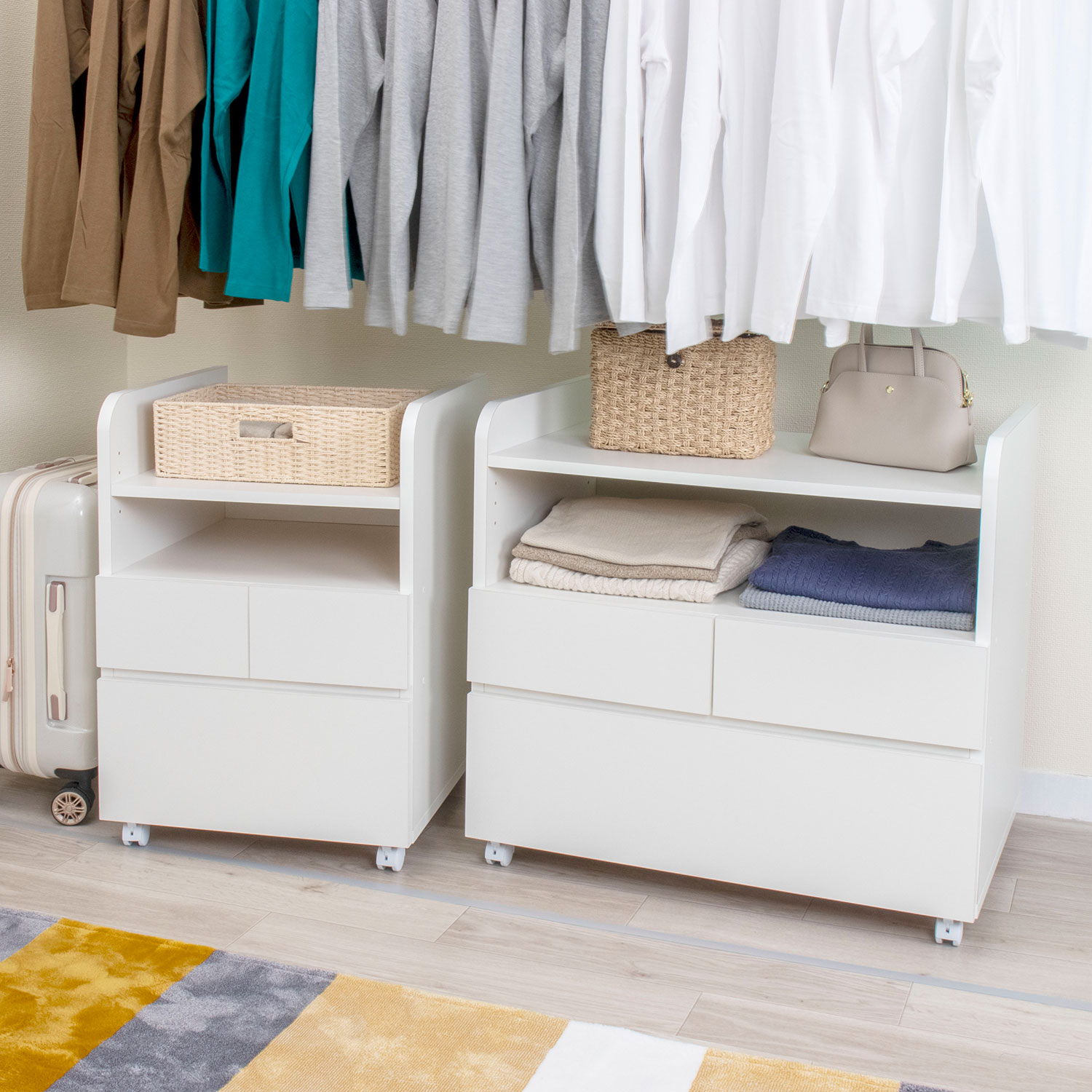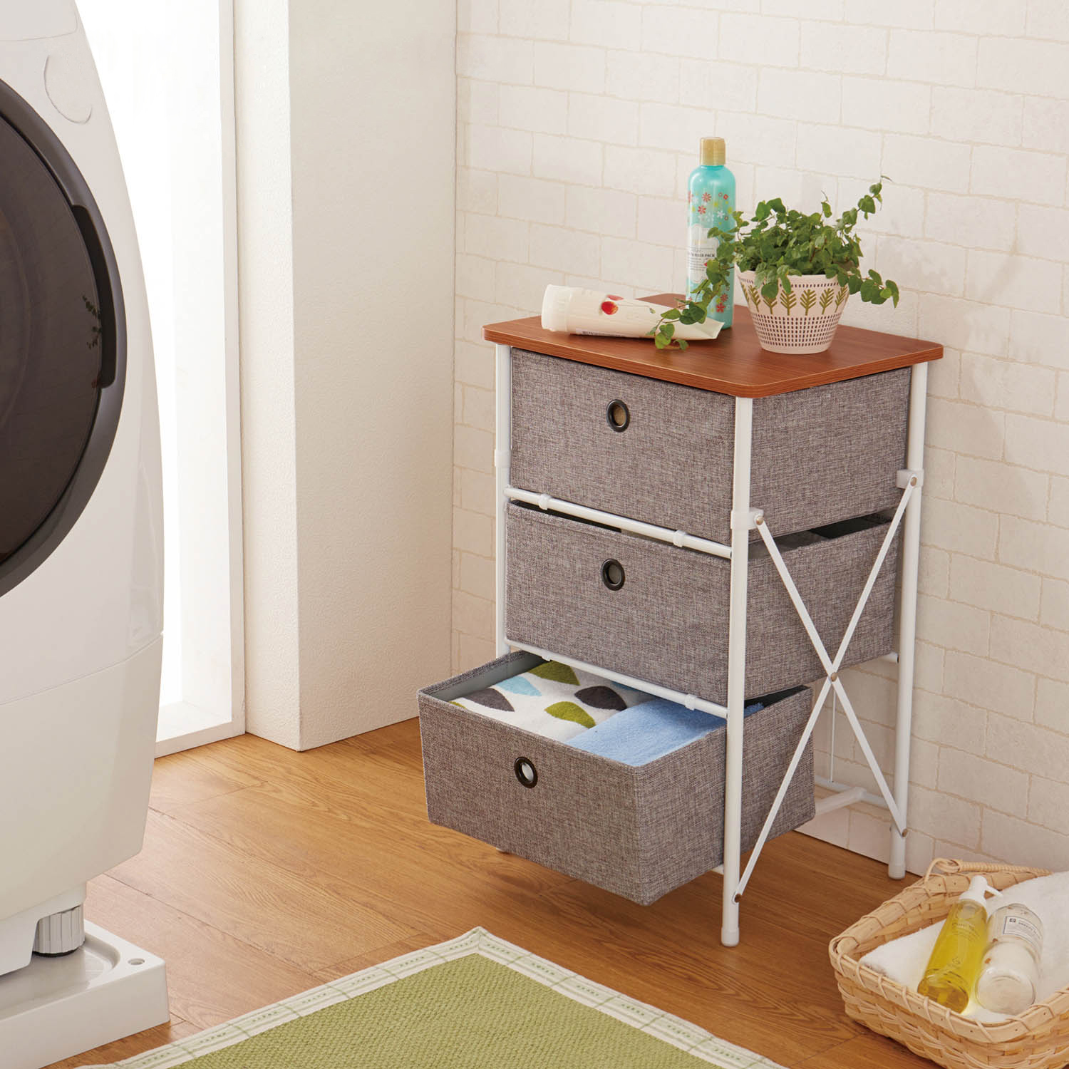 ●フレームを広げて補強の樹脂パーツをはめ込んだら、天板と引出しをセットするだけ♪面倒な作業なしにサッと設置できるのが嬉しいチェストです
