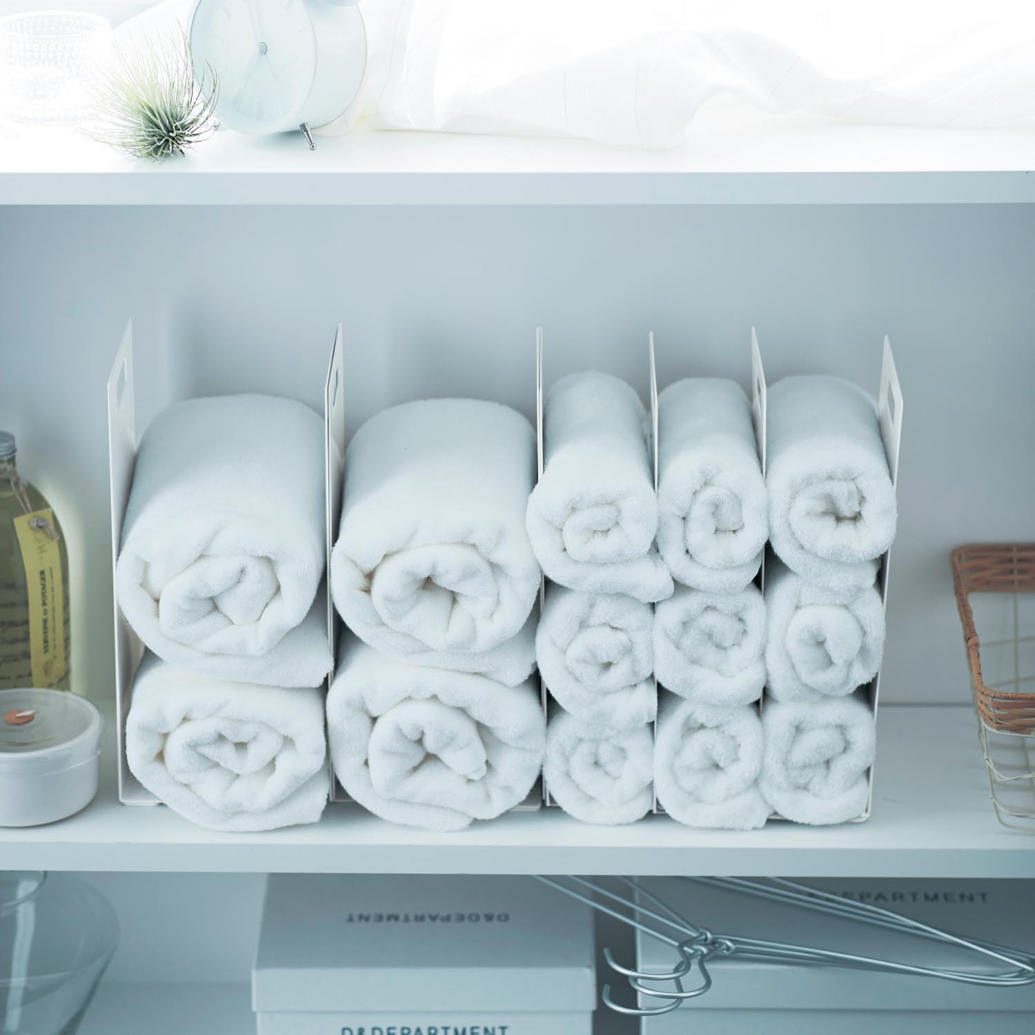 ● スライドさせるだけで収納幅を調節でき、フェイスタオルからバスタオルまで収納できます。
