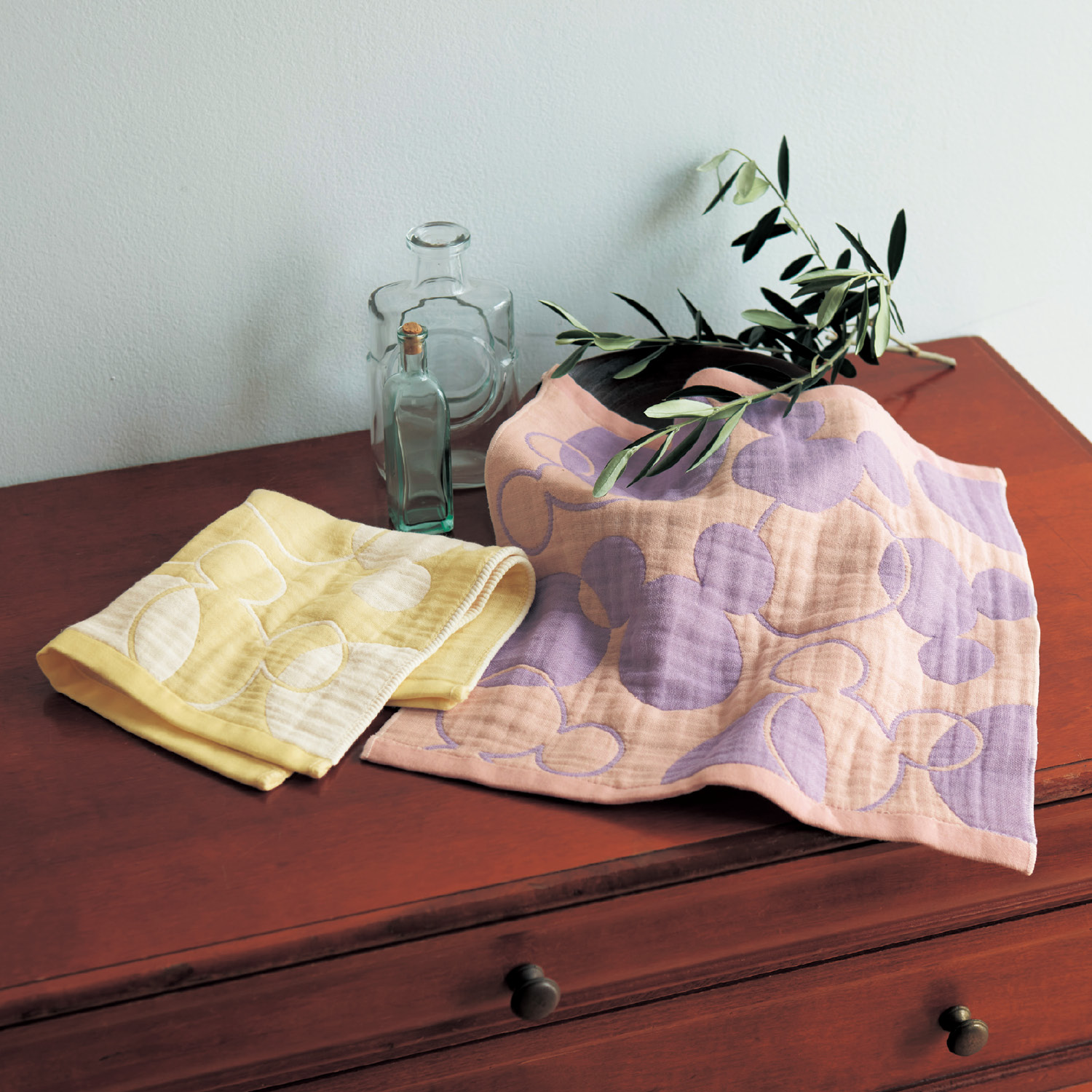 ーデザイン・スタイリングー ・ふんわりとした優しい肌触りで、吸水性もしっかり ・使いやすい大判サイズ ・ソフトな色合いでミッキーモチーフを表現 ・ピンク系・イエロー系の2色セット ー素材ー ・泉州南部織の6重ガーゼを使用 ・伝統の織り技法に独自の工夫をプラス ・ガーゼはキメ細かく、柔らかな肌触り