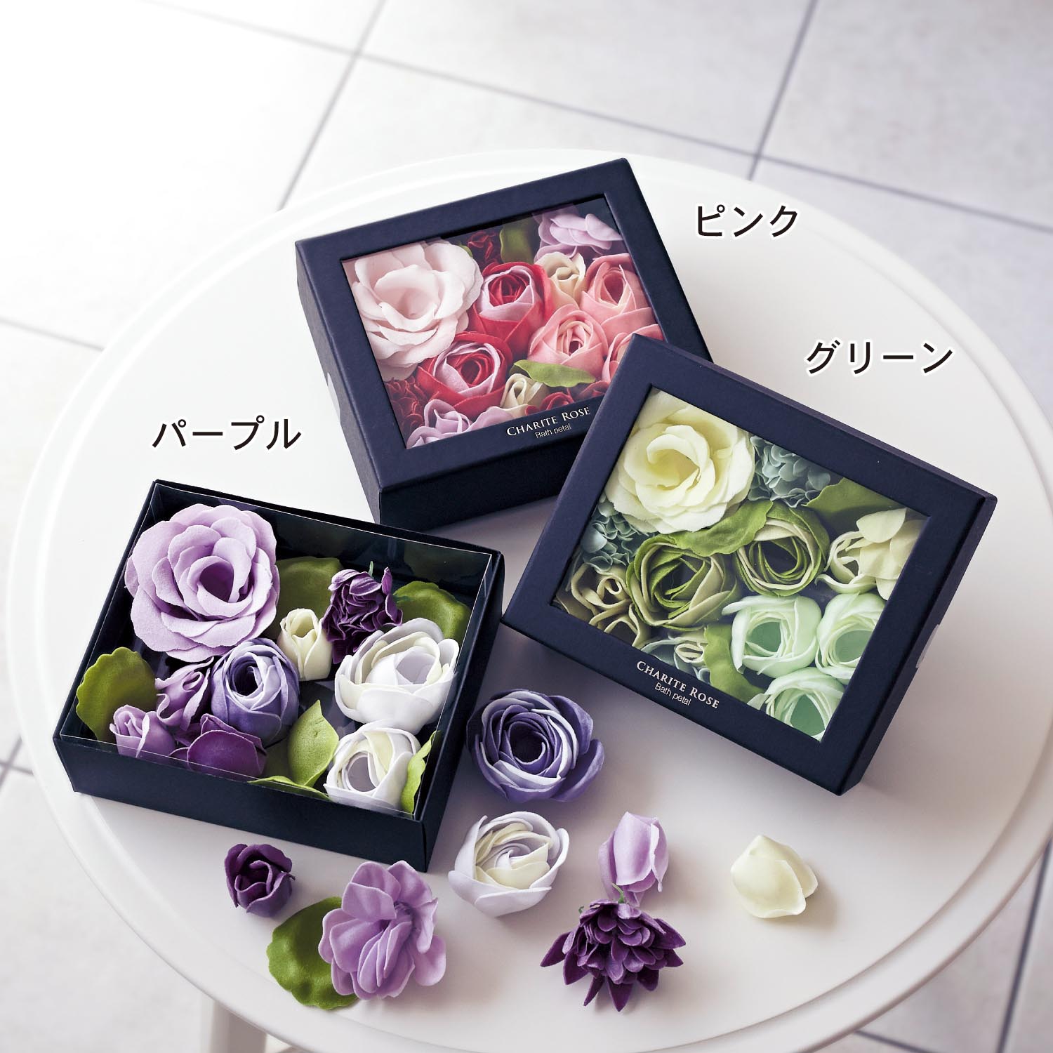 ●「グリーン」はタイディローズ(爽やかでおしとやかなローズの香り)、「パープル」はロマンスローズ(しっとりとした妖艶なローズの香り)、「ピンク」はグロスローズ(艶やかで気品のあるローズの香り)の3種類の色&香りをご用意しました