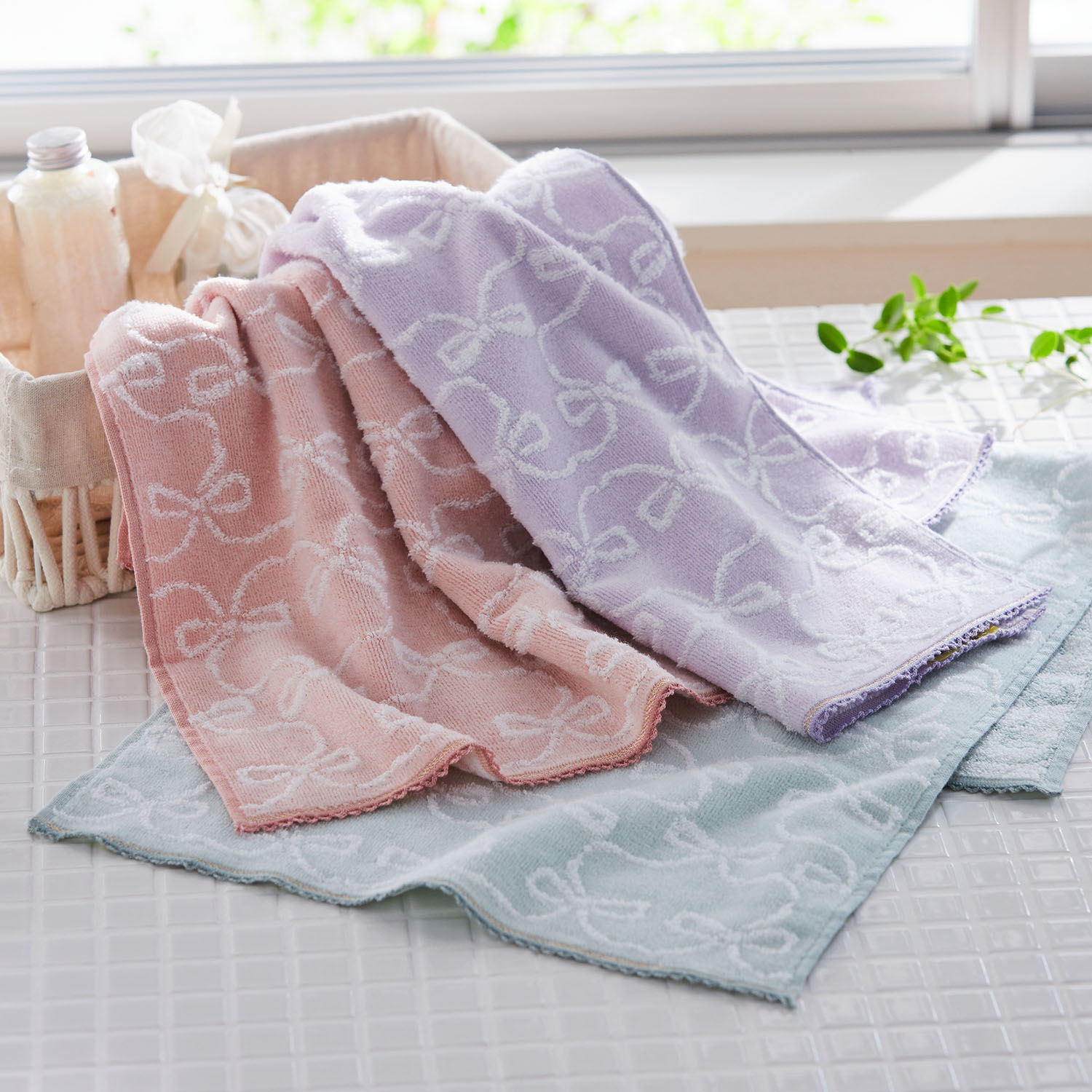 全体にかわいいリボン柄をデザイン縁もレース仕様でかわいいデザイン使いやすいスリムバスタオルもラインナップ無撚糸を使用しているので、ふんわりやわらか |